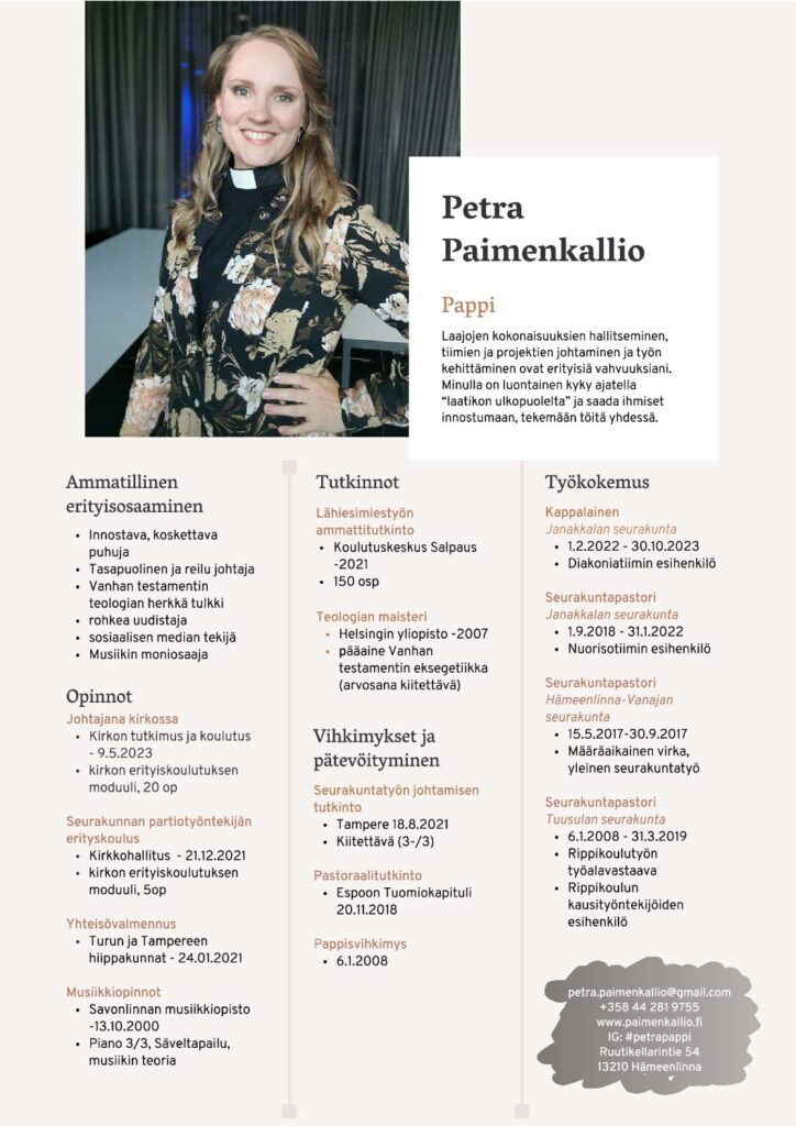 Toimin lähes koko opiskeluaikani Tuusulan seurakunnassa osa-aikaisena nuoriso- ja rippikoulutyön tekijänä. Kun valmistuin papiksi, siirryin samassa tiimissä uuteen rooliin, ja palvelin nuoriso- ja rippikoulutyön pappina yhdeksän vuoden ajan. Tuusulan jälkeen olen ollut pappina Hämeenlinnassa, Janakkalassa ja Hyvinkäällä.